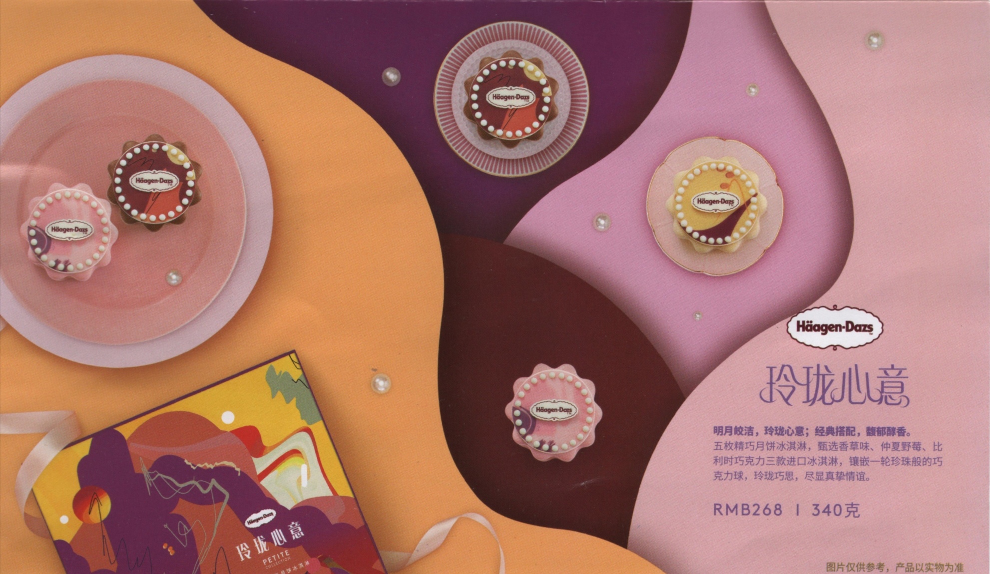 比利时巧克力味*2 五枚精致月饼冰淇淋,内藏柚子,香草,仲夏野莓,巧克力四种口味进口 冰淇淋,搭配香浓软滑的巧克力,并镶嵌一轮珍珠般的巧克力球。真挚情 谊尽在玲珑巧思之间。